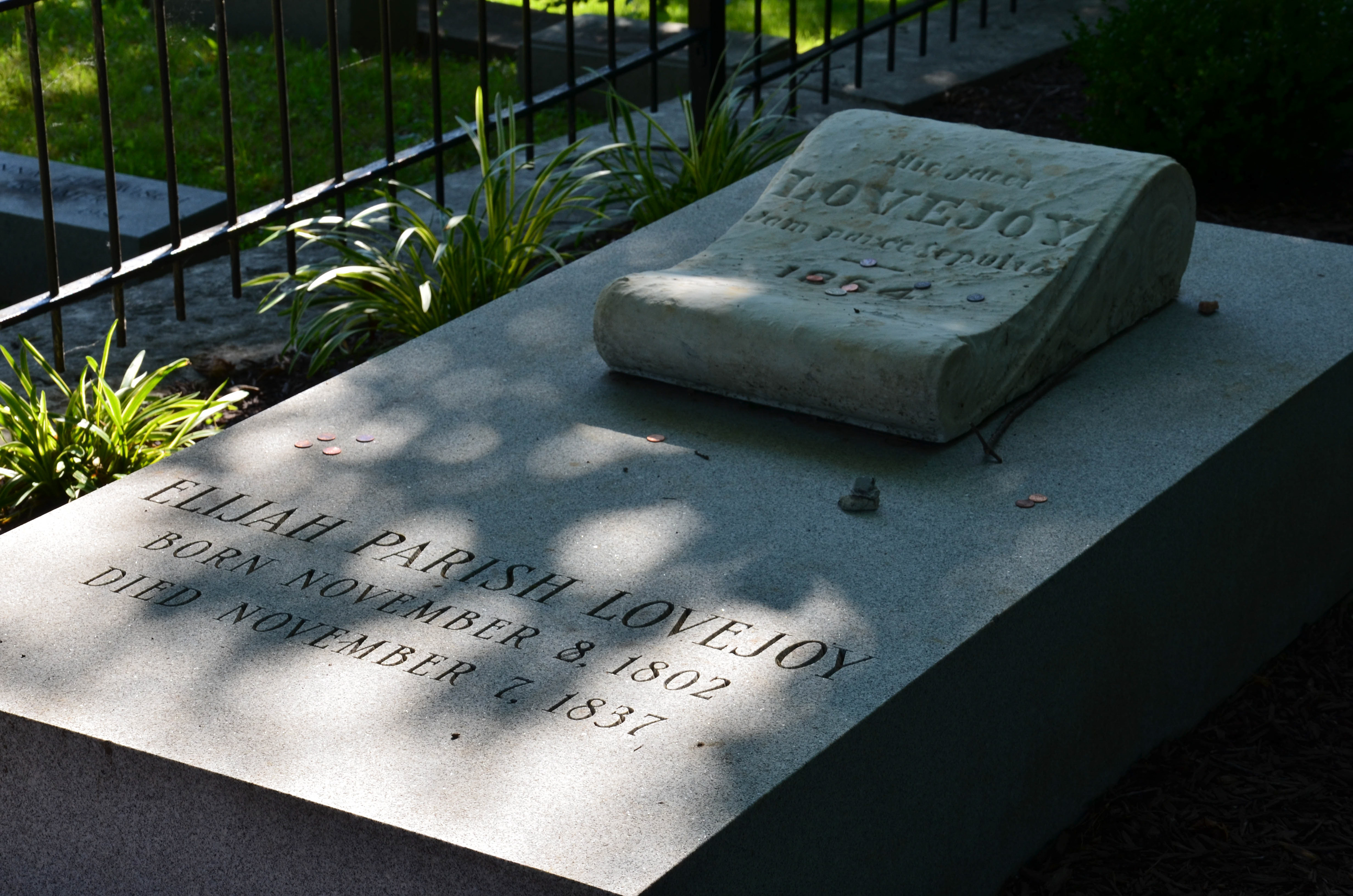 This is the grave of Elijah Lovejoy, a martyr and hero to journalists. In the decades leading up to the Civil War, Lovejoy was an outspoken abolitionist who championed freedom in his newspaper. He moved from Missouri to Alton, Illinois in hopes of a more receptive audience, but twice they came for his press and threw it in the river. The third time, Lovejoy stood to defend it, and they killed him. Many called it the first battle of the Civil War. Today we remember him as one who spoke truth to the world, whether or not they wanted to hear it.